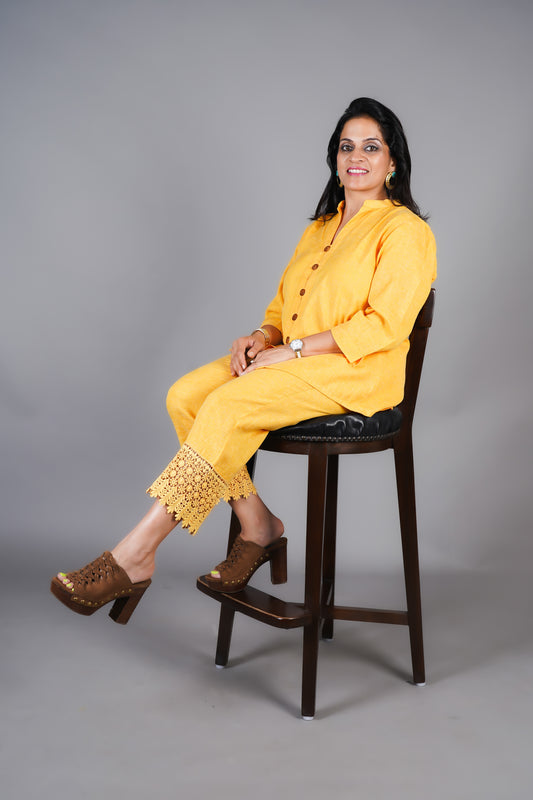 Our cotton yellow co-ord set with lace detailing on its pants, increases both the style...