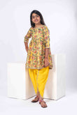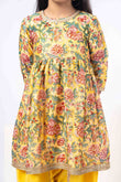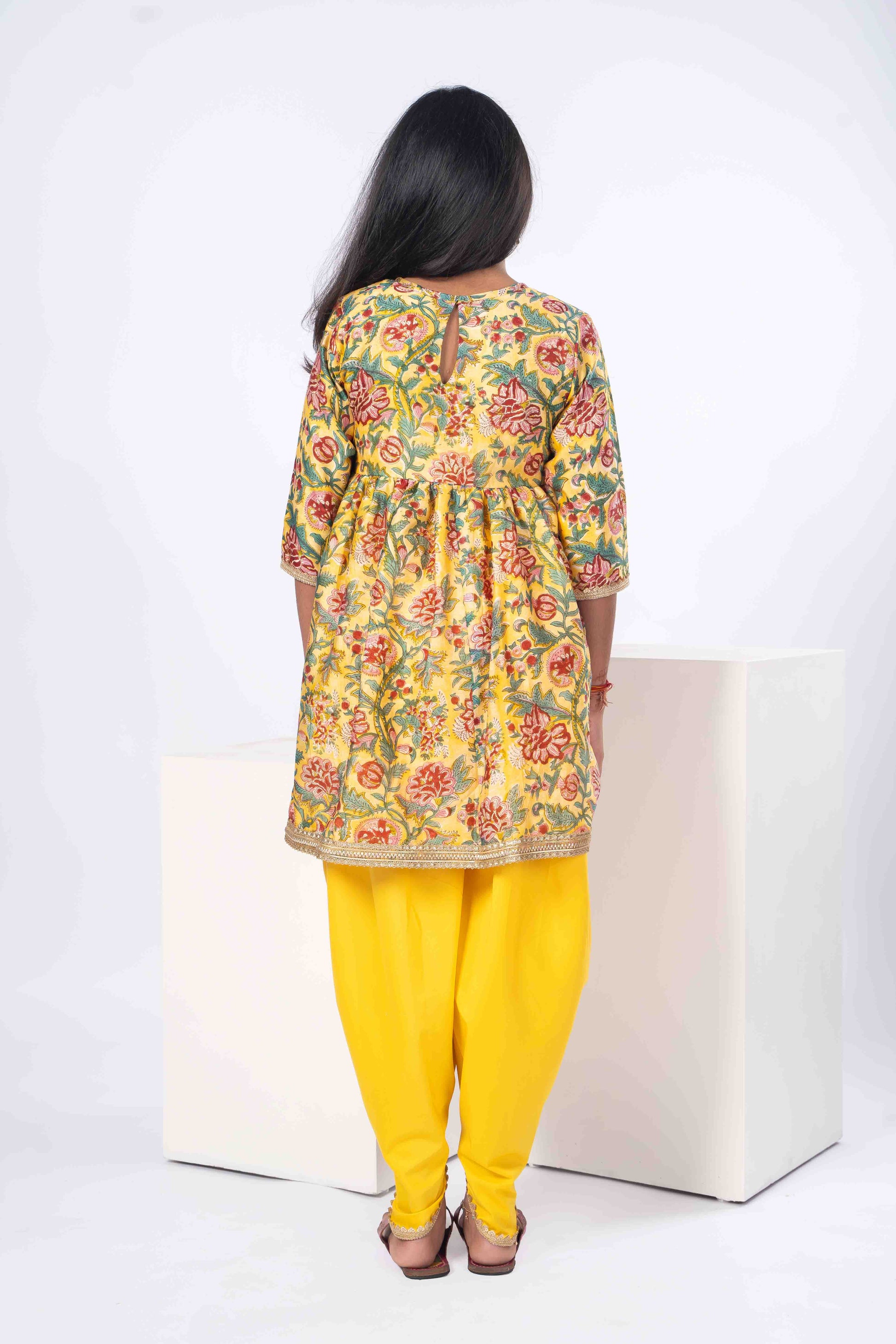 Bright, playful, and full of festive charm - made in lightweight Chanderi fabric, this outfit comes in a vibrant yellow base highlighted with delicate red and green floral patterns. Perfect for festivals, family celebrations, or twinning moments with siblings, this set blends traditional elegance with modern comfort.