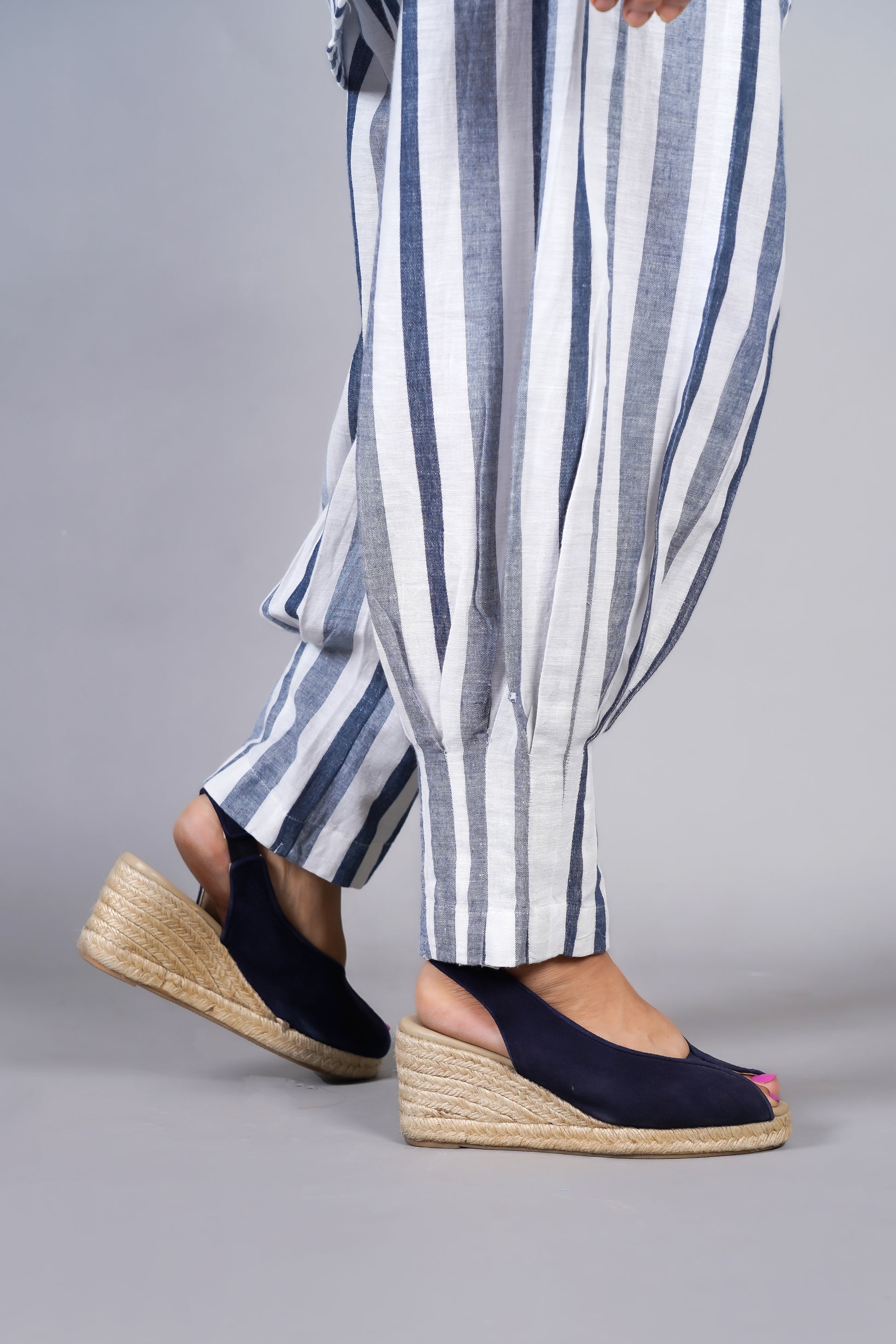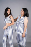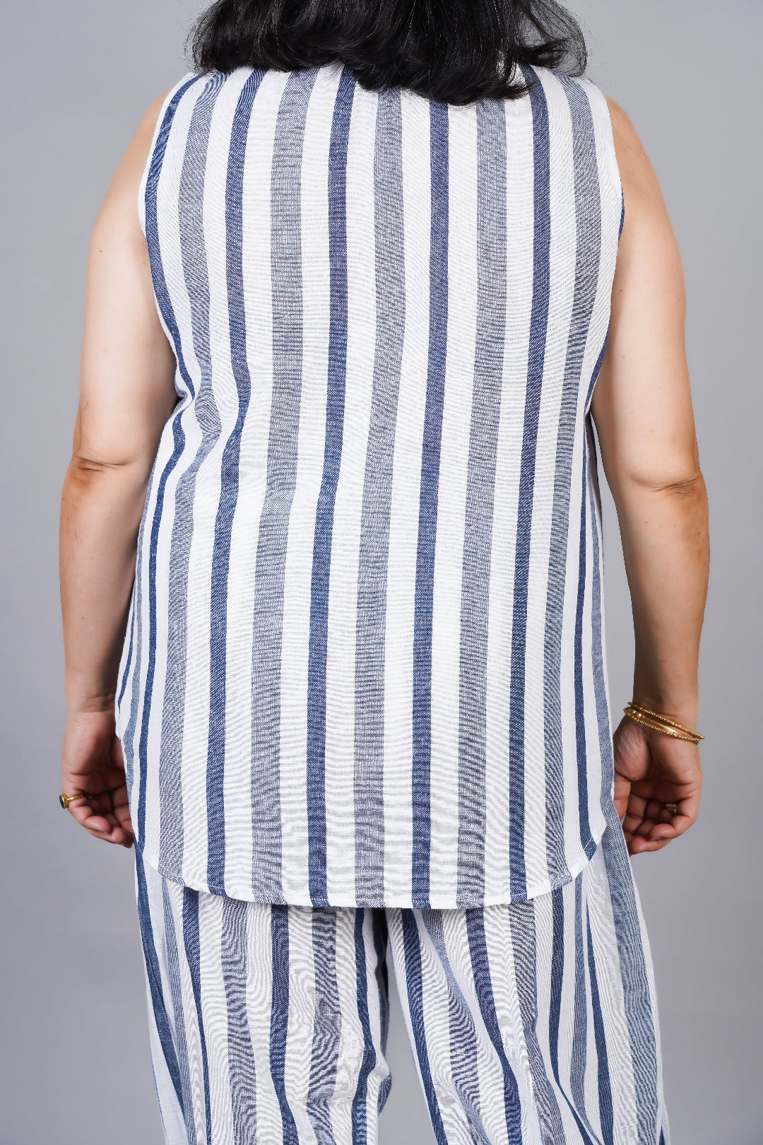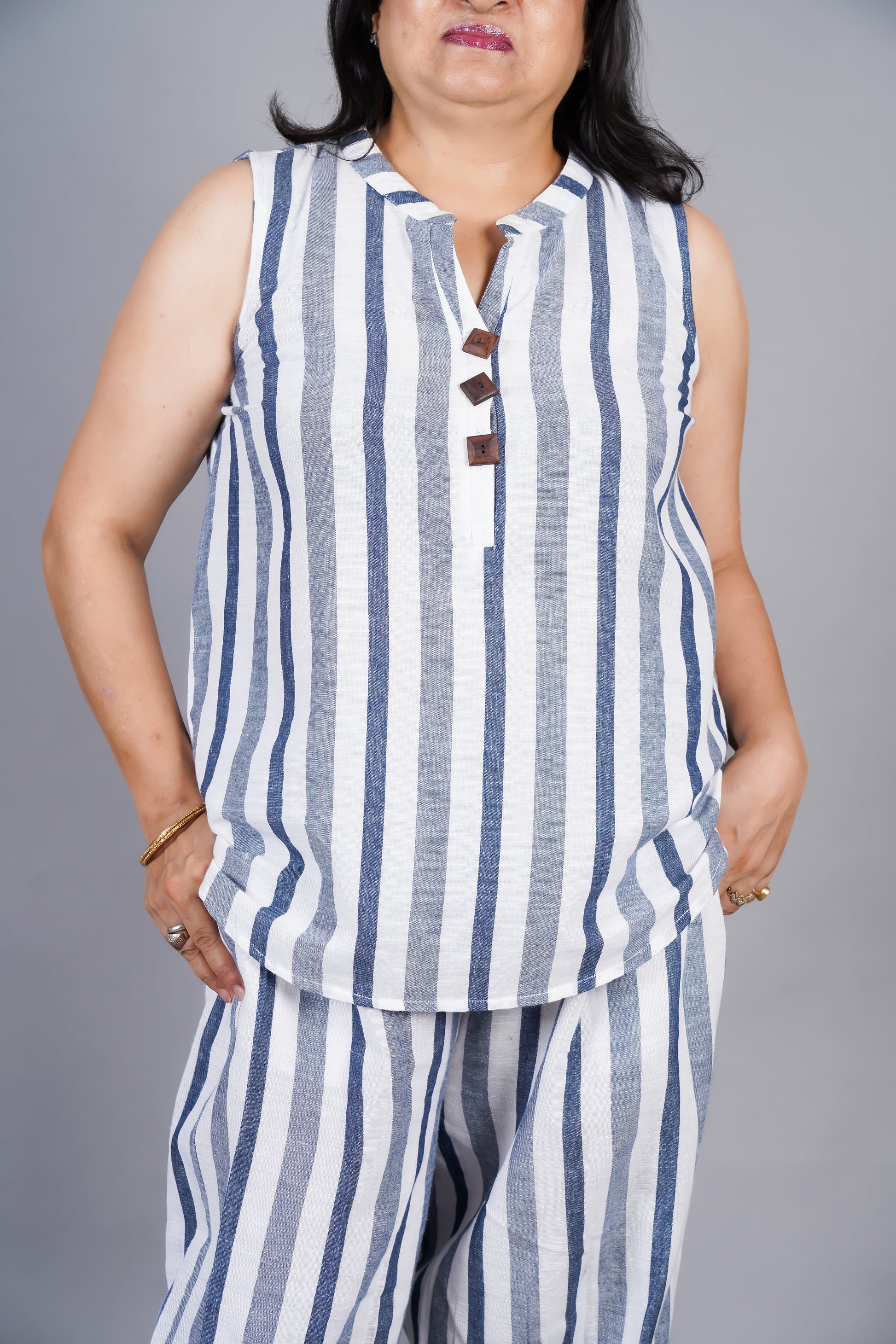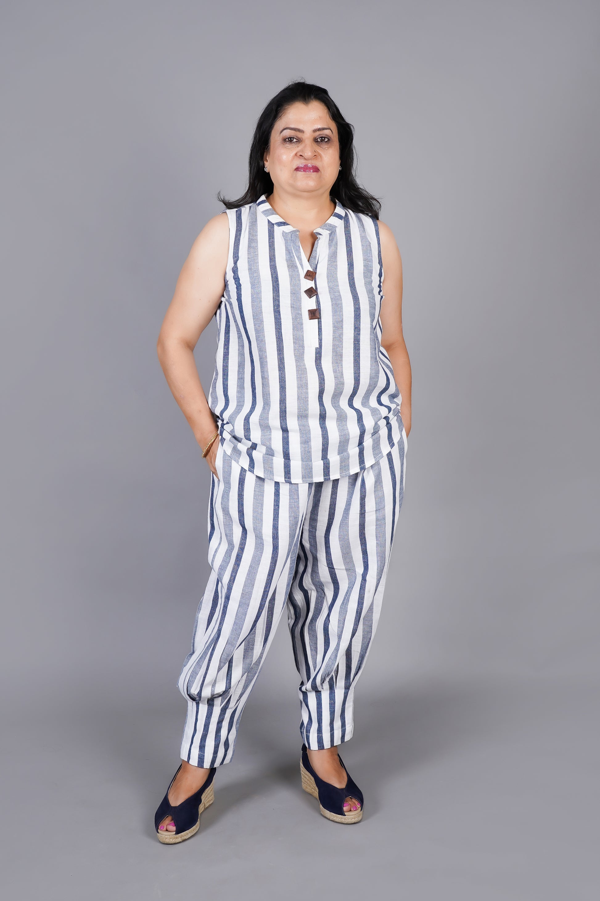 Our navy striped co-ord set in cotton linen increases both the style and comfort quotient for any season