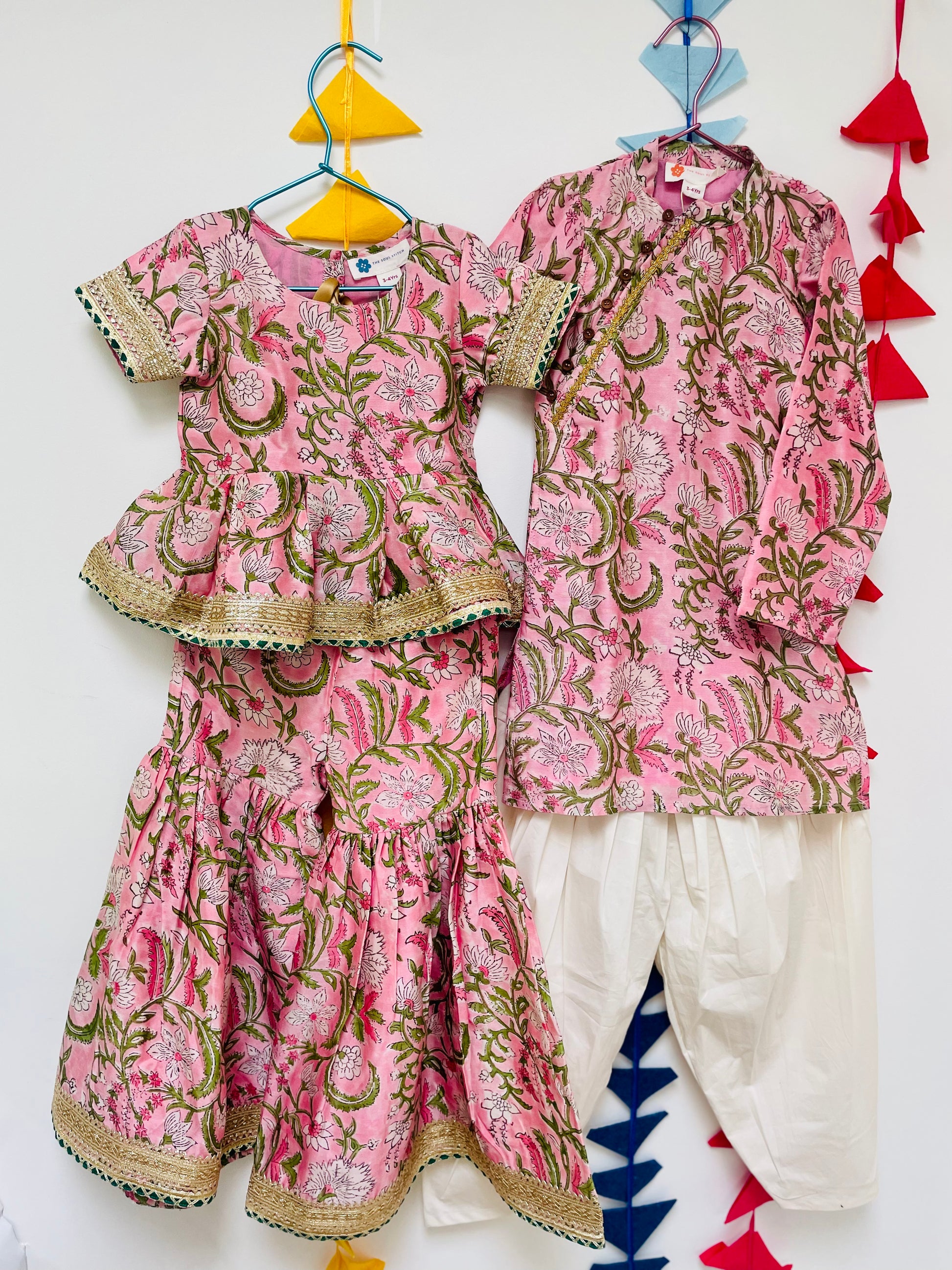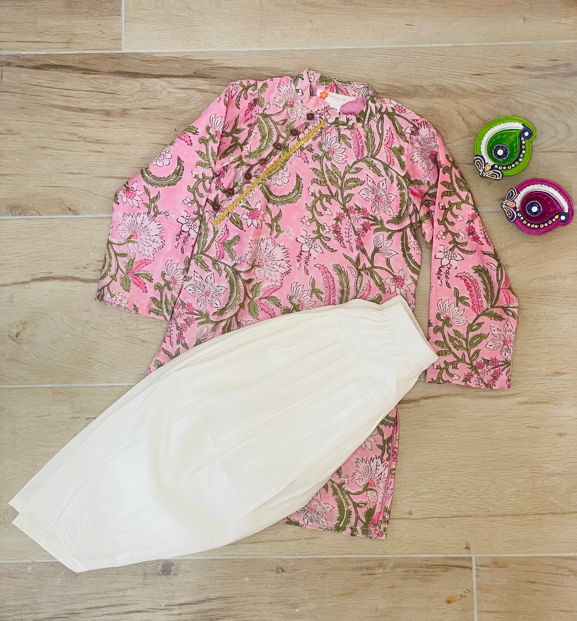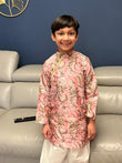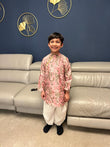 Crafted from luxurious silk chanderi fabric, the kurta boasts a delicate sheen that catches the light with every movement. Its soft pink hue is adorned with intricate prints, adding a playful yet sophisticated touch to the ensemble.