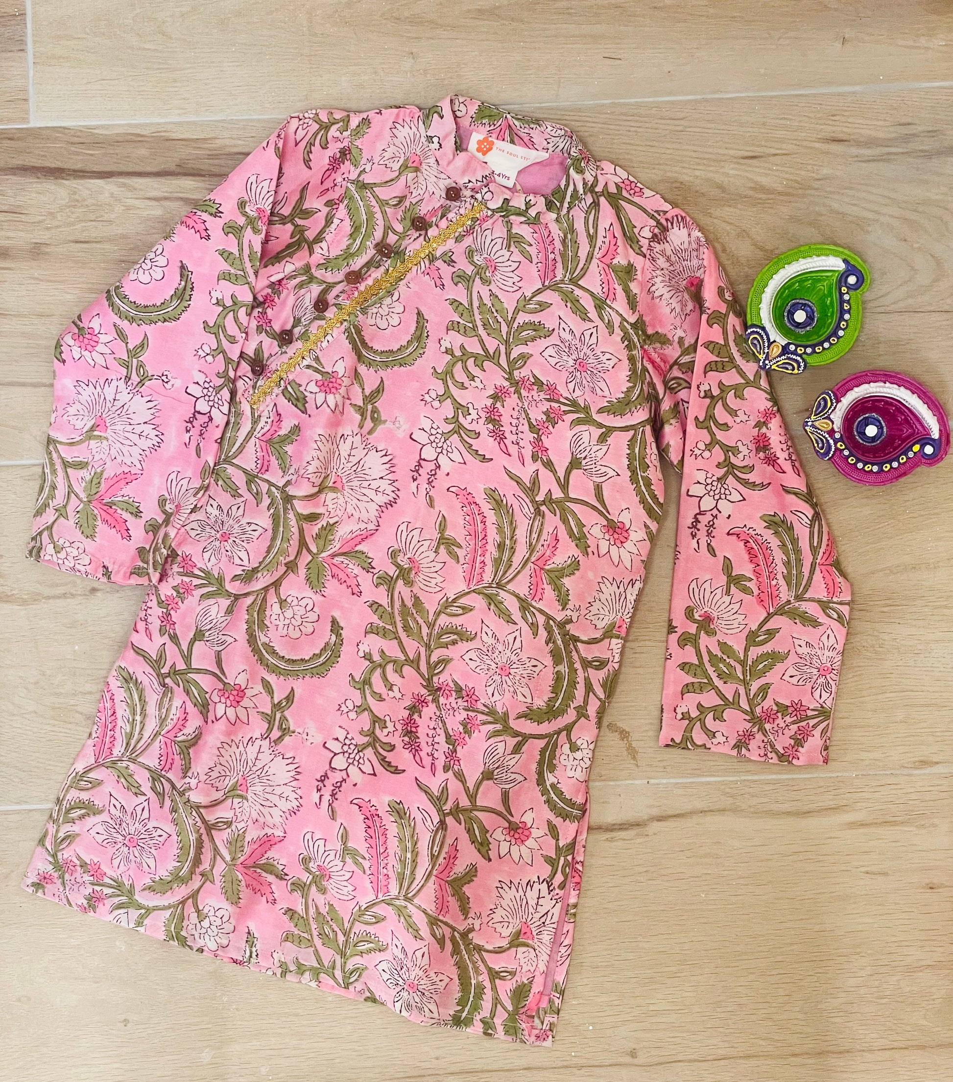 The kurta features a classic silhouette with a mandarin collar, angrakha style buttons with gota and full-length sleeves, offering a perfect balance of comfort and style.