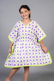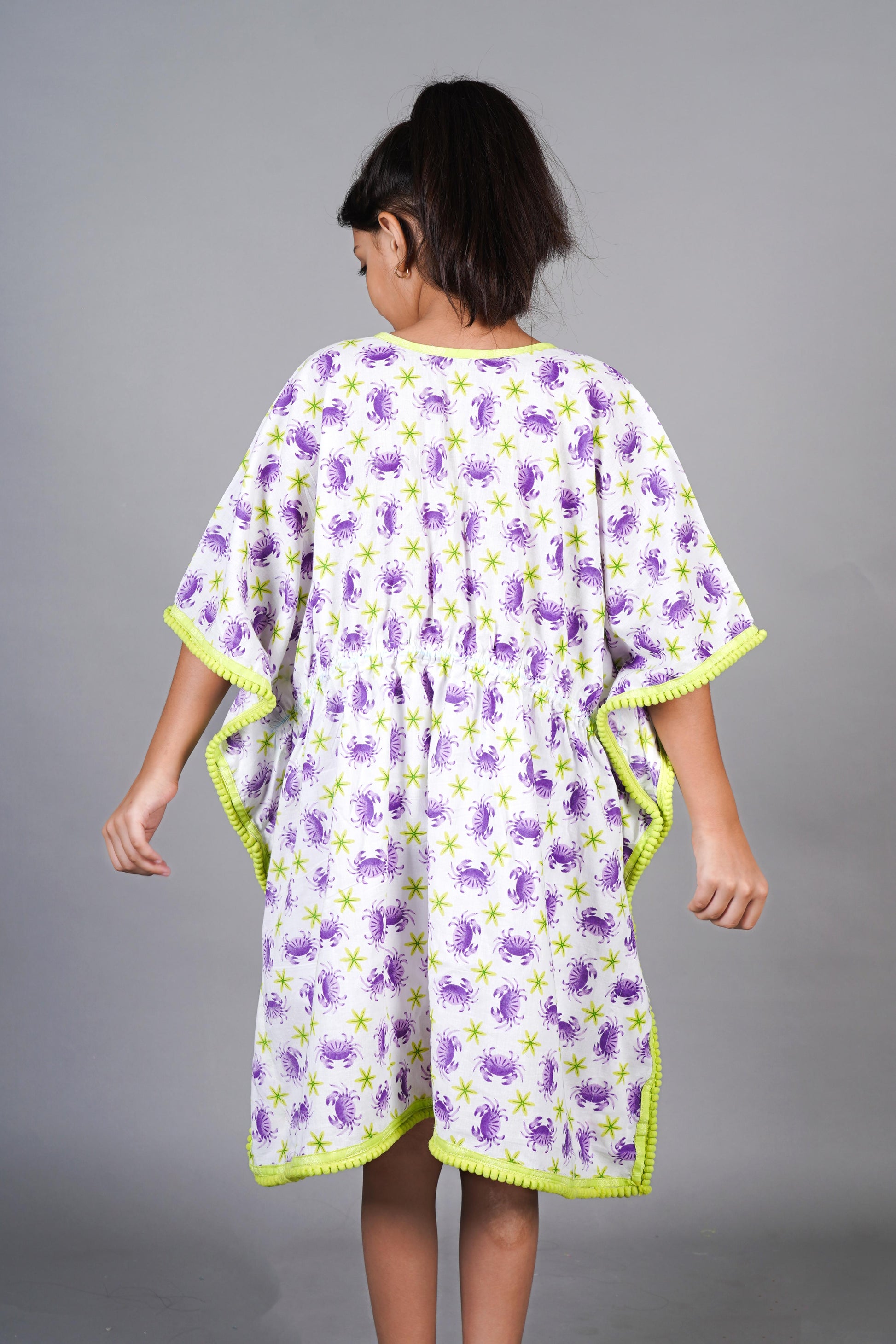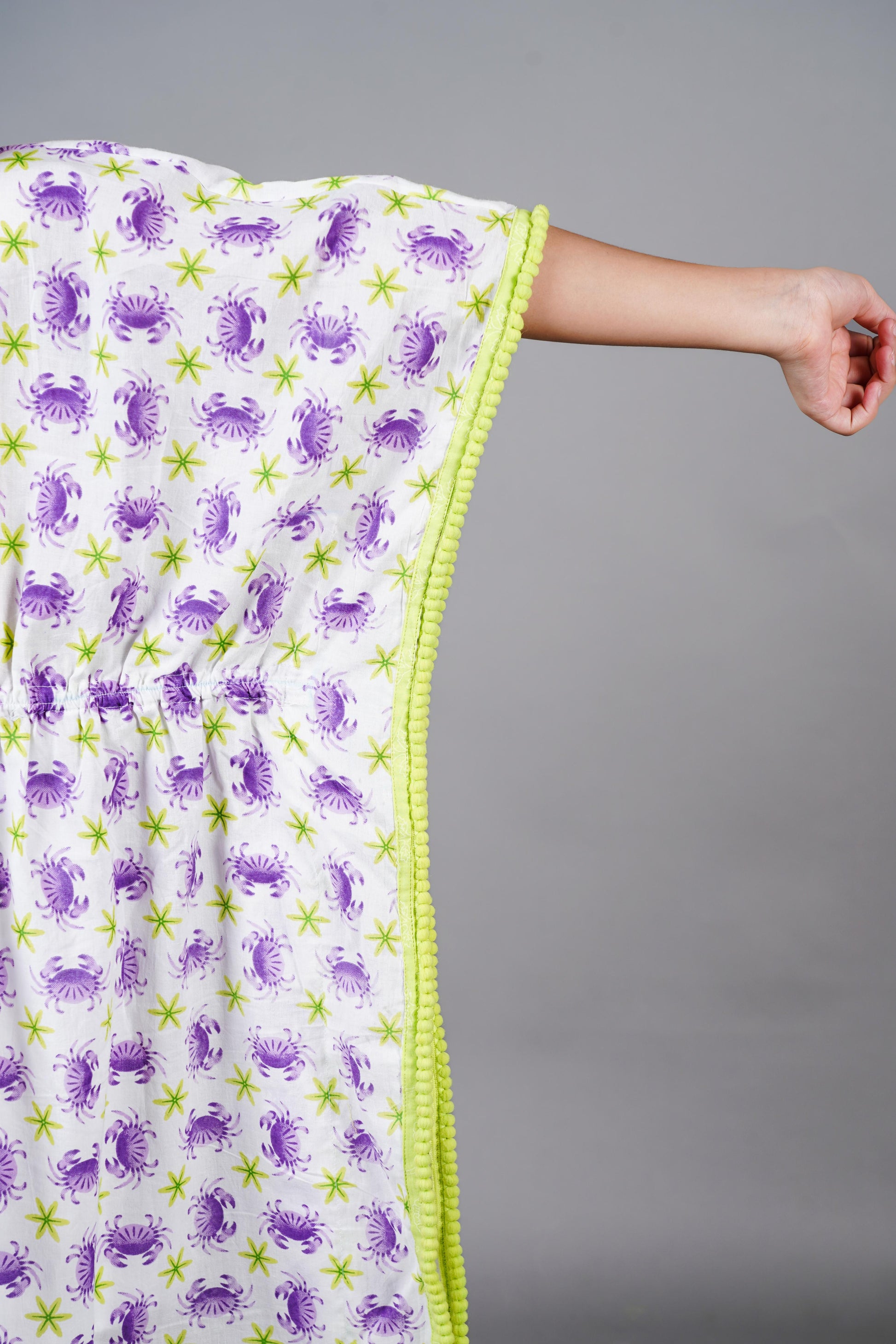 Our playful and fun crab kaftan with lime pom-poms makes it a super fun and playful outfit. The pure cotton fabric gives it the extra cooling comfort required on a hot beach day