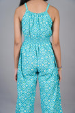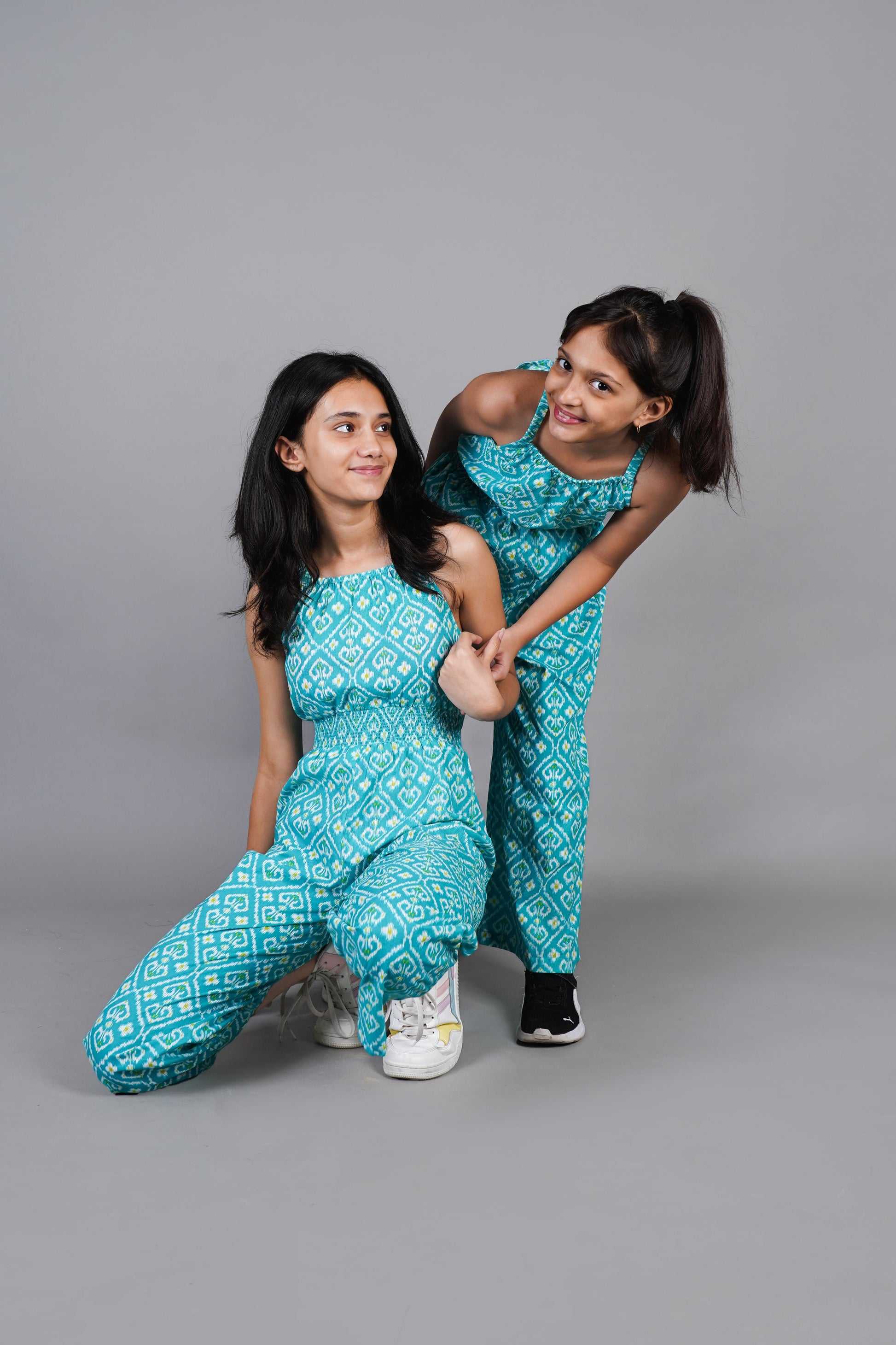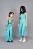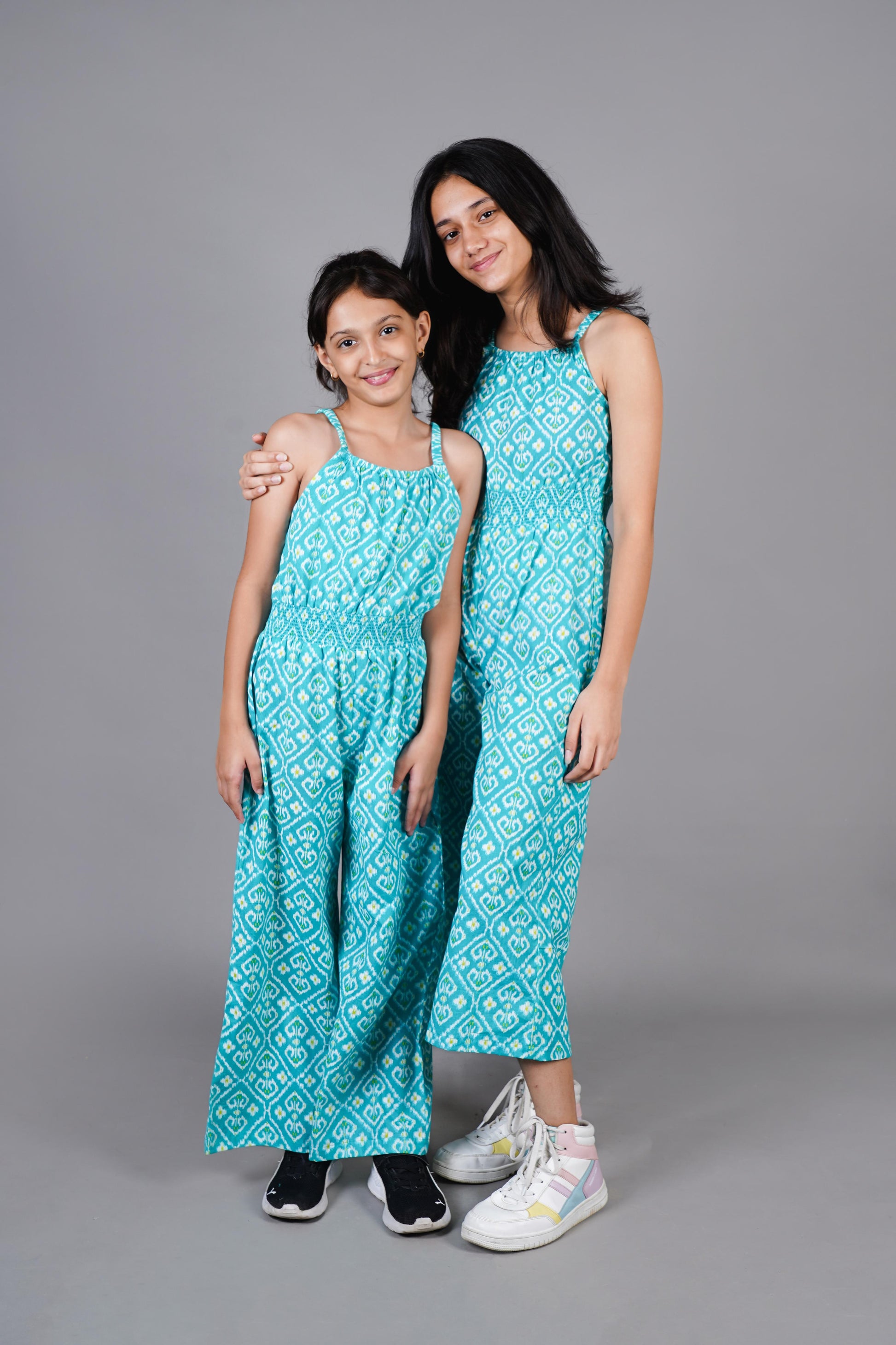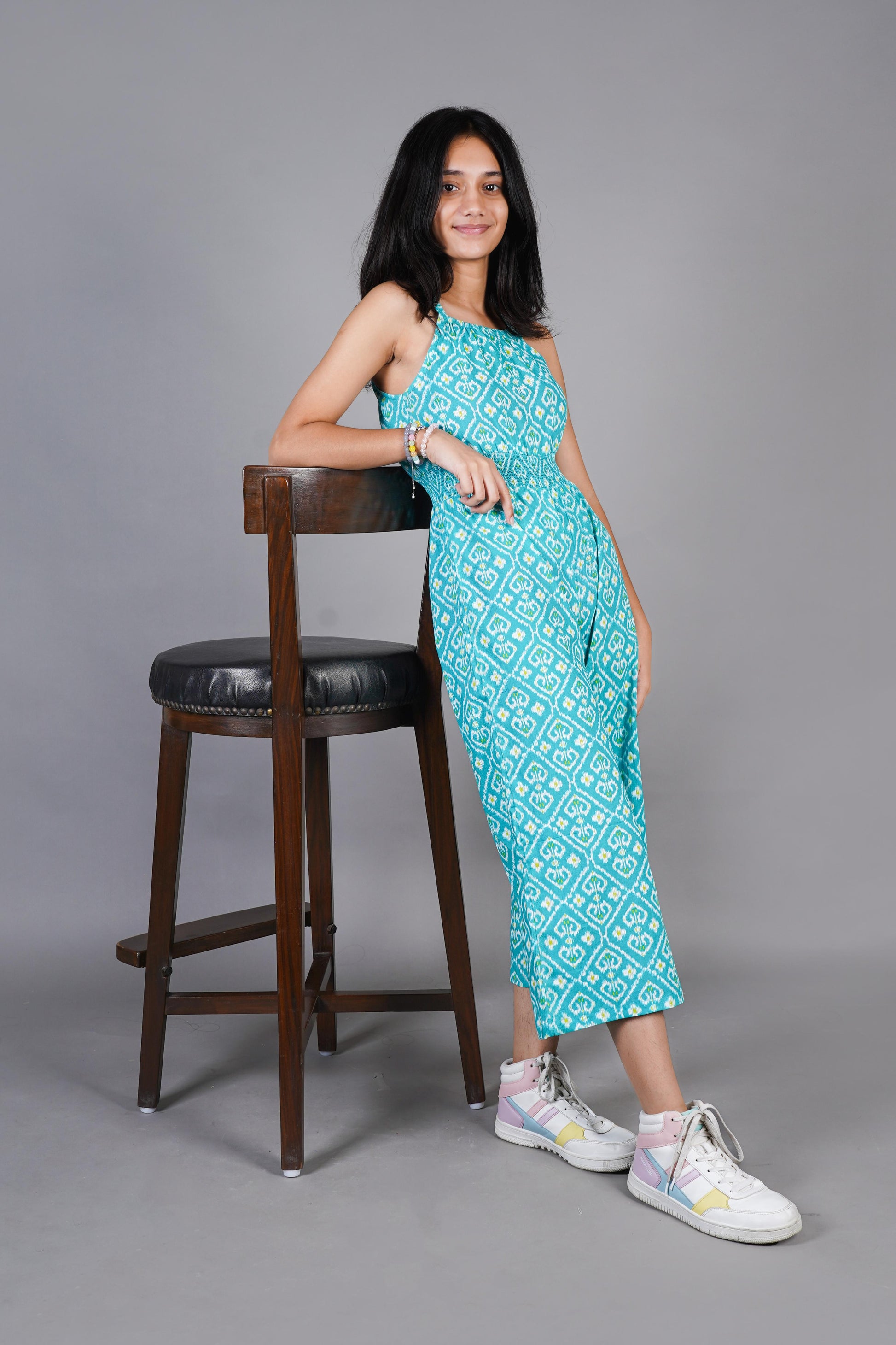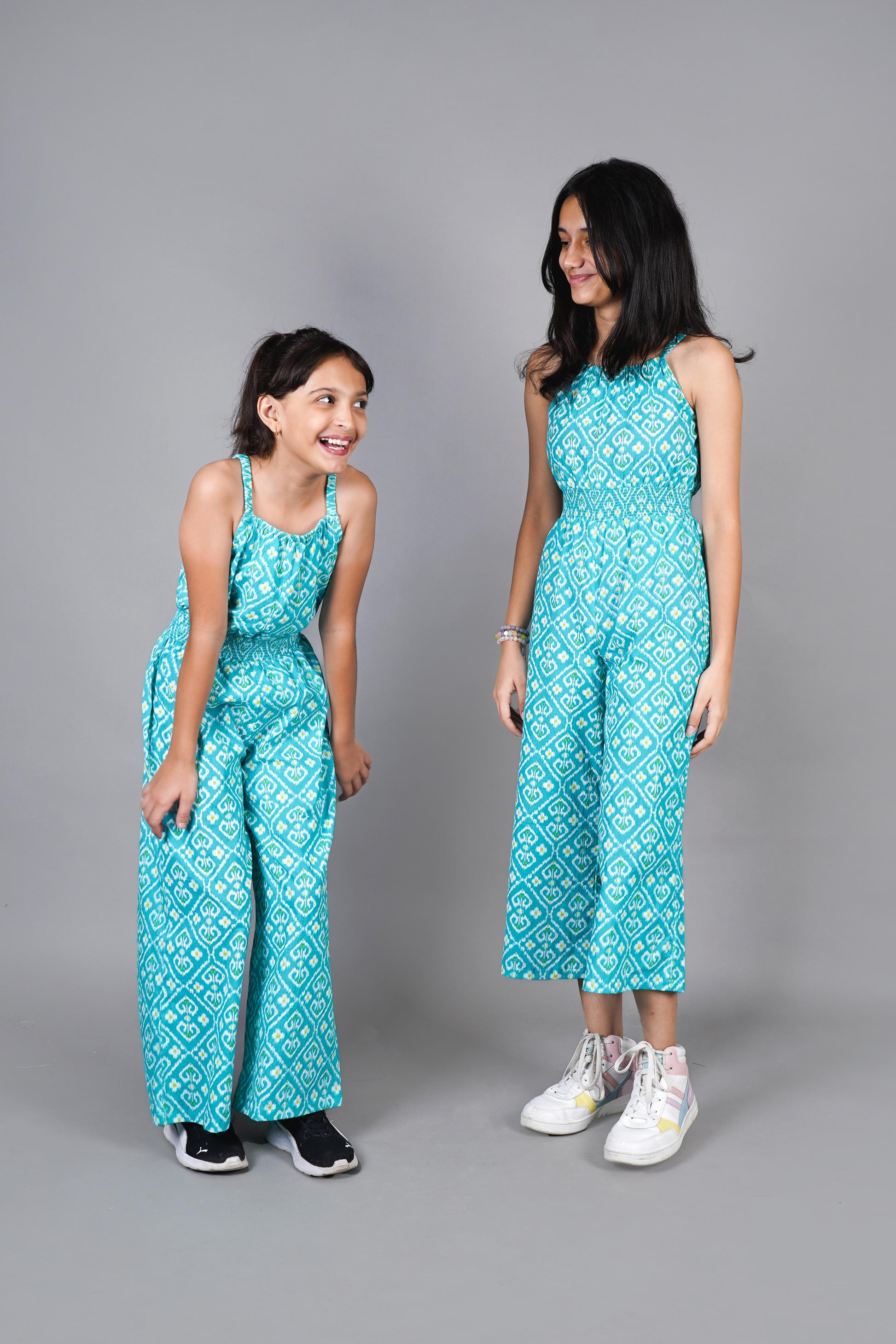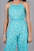 Pure cotton Ikat print jumpsuit with smocking along the waistline, ensures a comfortable and smart fit for your little fashionista.