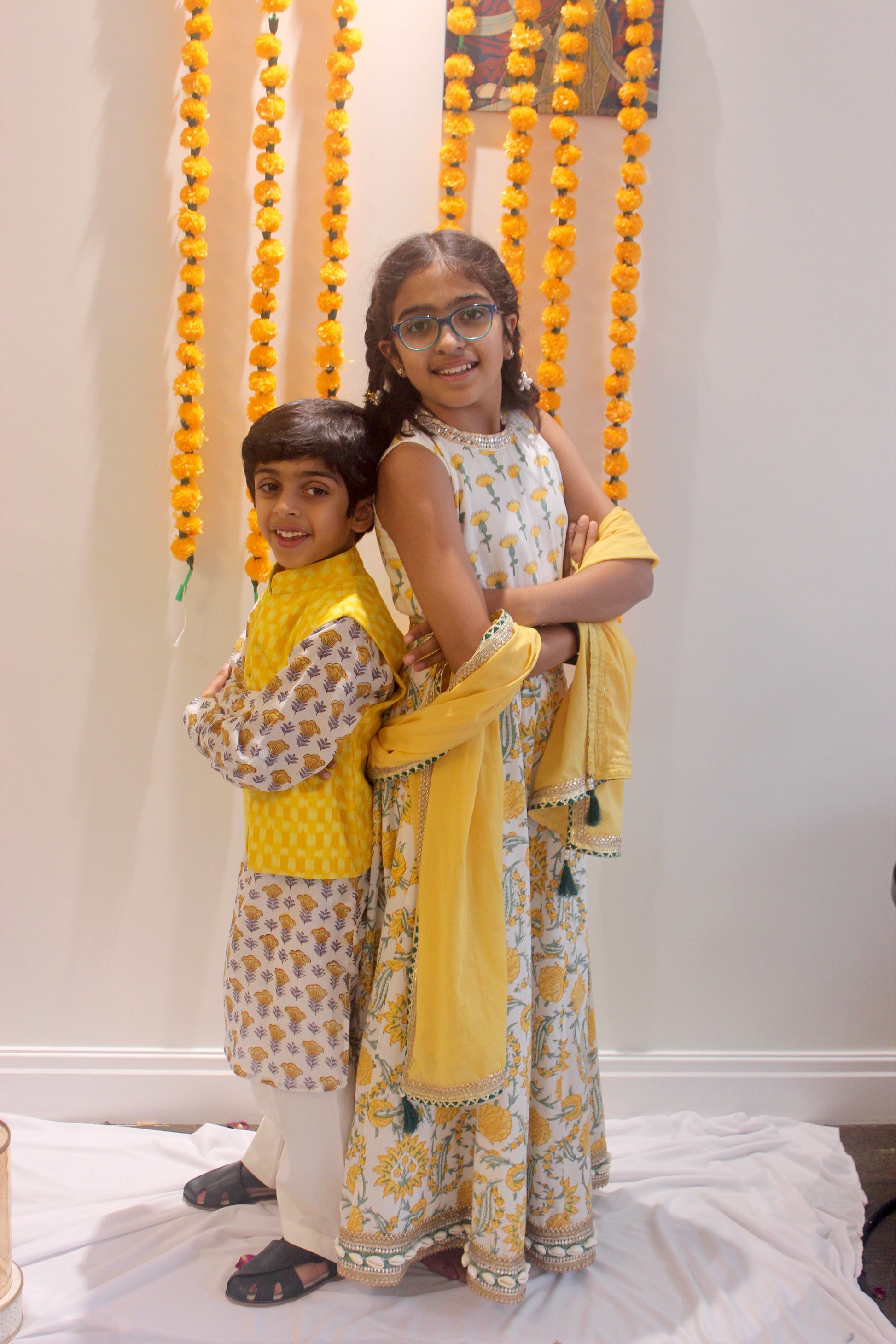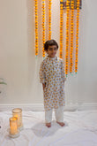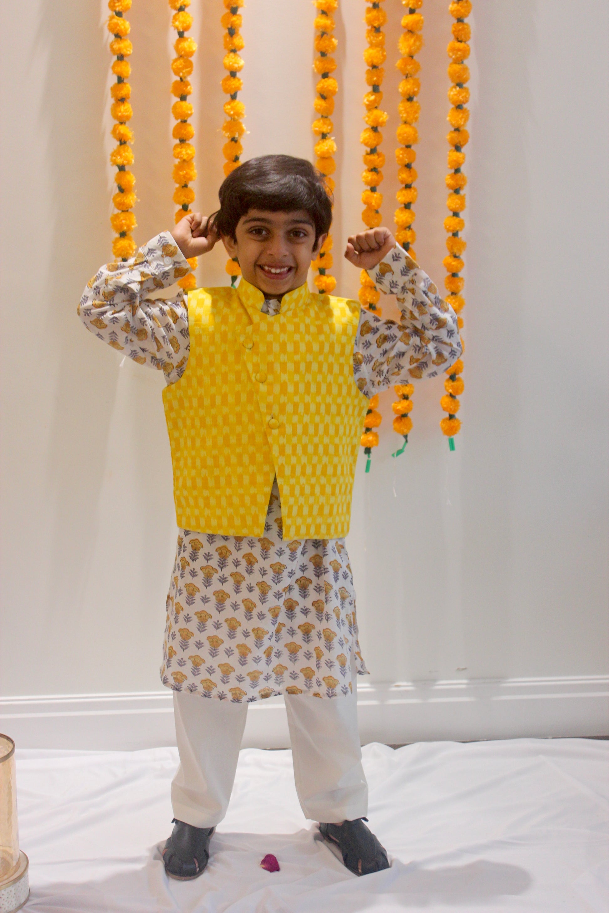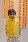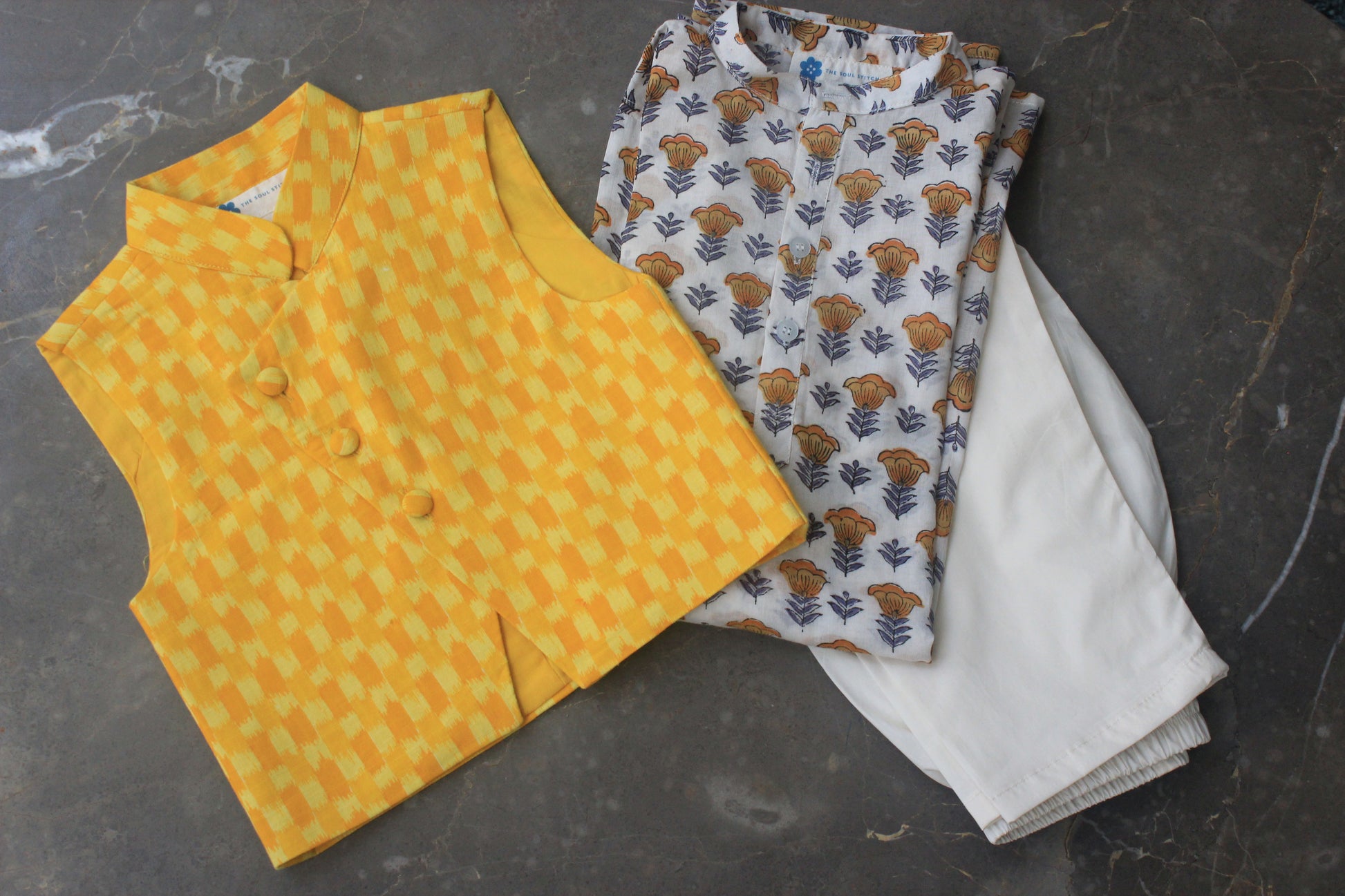 White Block Print Kurta and Pyjama with Yellow Nehru jacket