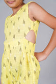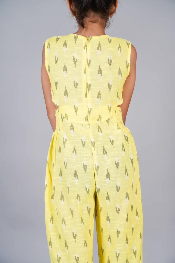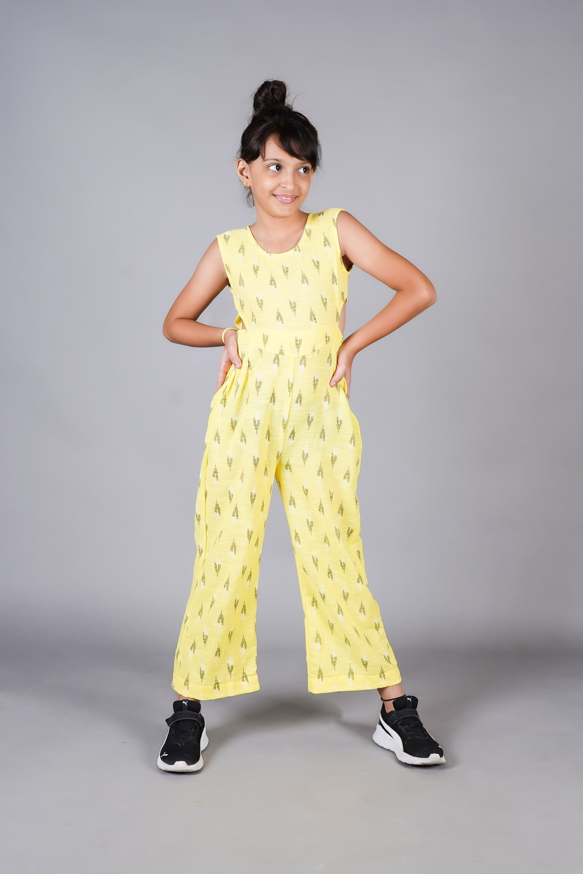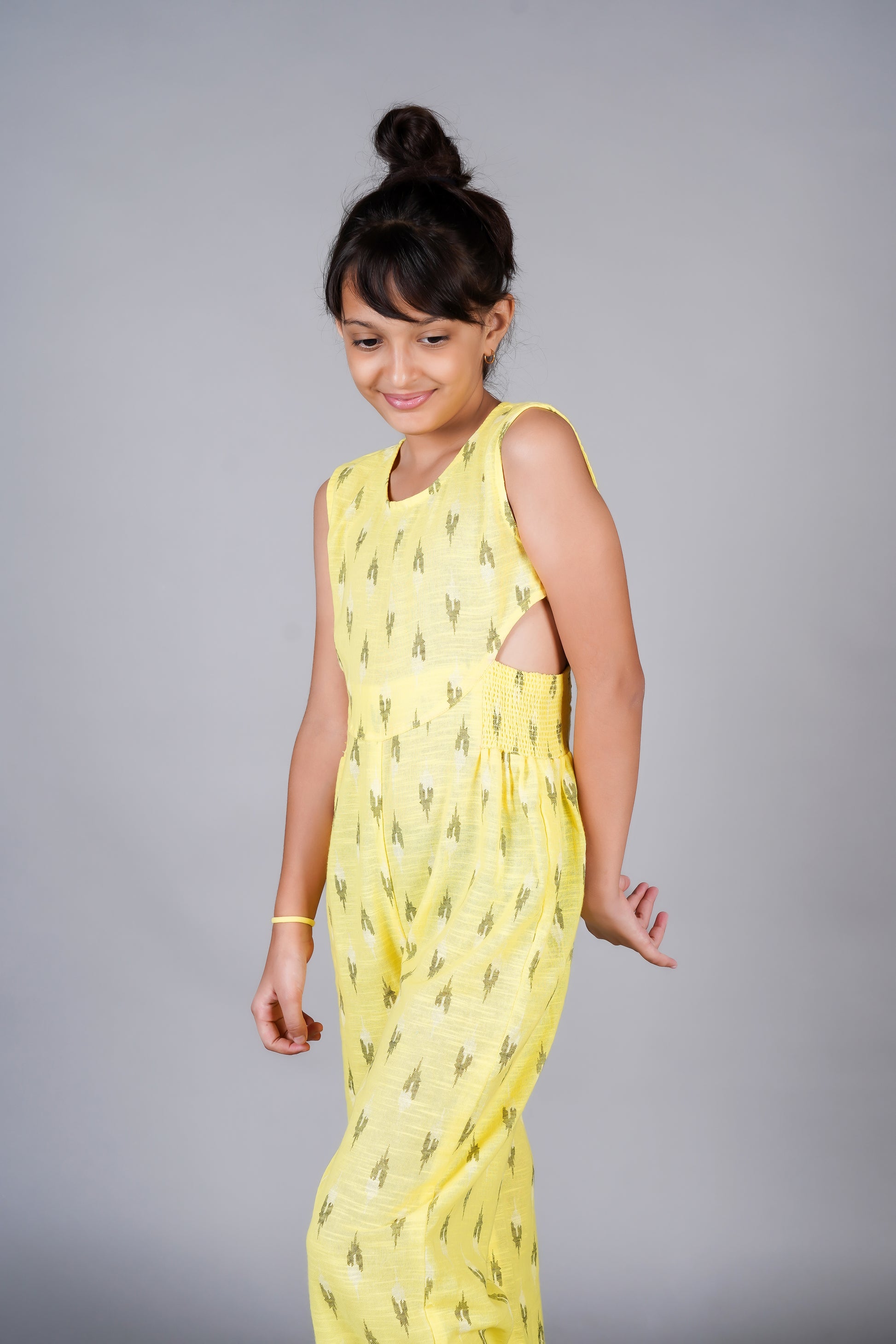 Our gorgeous yellow Ikat jumpsuit with cut-out detail and smocking along the waistline is a comfortable yet stylish must-have in your little one’s wardrobe.